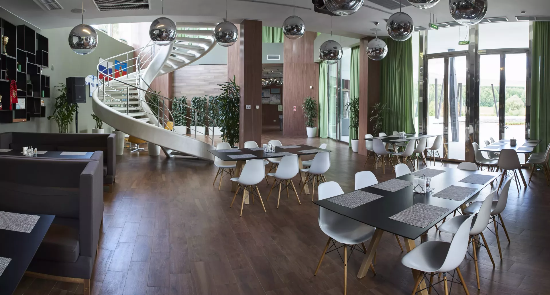 Большой зал с панорамными окнами подойдет для проведения стратегических сессий и других бизнес-мероприятий